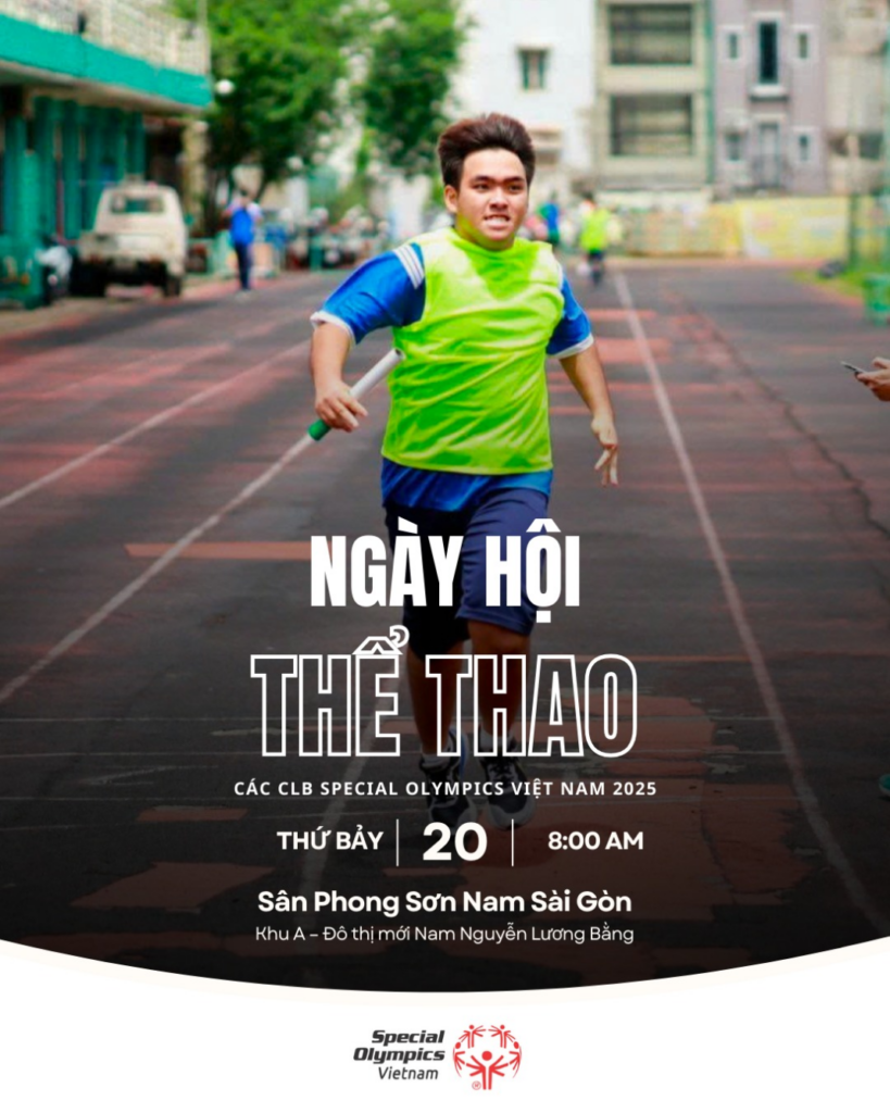 | Ngày hội Thể thao các Câu lạc bộ Special Olympics Việt Nam 2025 Lan tỏa tinh thần hòa nhập – Chung tay xây dựng cộng đồng không rào cản . Thời gian: 8g00 – 11g00, Thứ Bảy, ngày 20/12/2025 . Địa điểm: Sân Phong Sơn Nam Sài Gòn, Khu A – Đô thị mới Nam Nguyễn Lương Bằng, Khu đô thị Phú Mỹ Hưng, Quận 7, TP. Hồ Chí Minh . Đơn vị tổ chức: – Special Olympics Việt Nam (SOVN) – Phối hợp: Hội Phụ huynh CLB Thể thao Special Olympics Việt Nam và các đơn vị giáo dục – thể thao chuyên biệt tại TP.HCM . Đối tượng tham dự: Vận động viên Special Olympics, huấn luyện viên, đại diện các đơn vị, phụ huynh, tình nguyện viên và khán giả . Nội dung thi đấu – hoạt động: – Điền kinh: Bật xa tại chỗ; chạy 60m – 100m – Bóng rổ: Ném bóng vào rổ tính điểm (thi đấu đồng đội) – Giao lưu văn nghệ giữa các đơn vị |